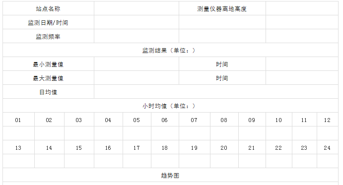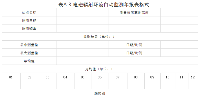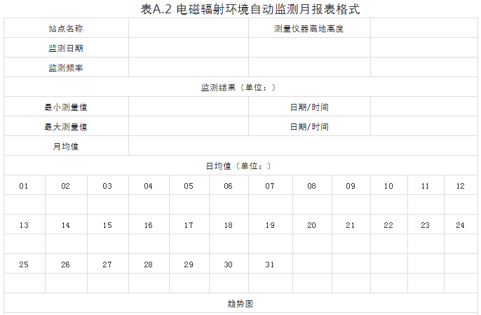 记录监测时间内的最大测量值、最小测量值及各周期的均值,并生成监测时间内的趋势图。电磁辐射环境自动监测报表格式见附录A。